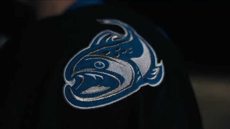 The collar of the jersey is blue, with a blue Under Armour logo on a black insert at the front. The UA logo also appears in a blue panel on the back shoulders. The trout from the Steelheads’ primary logo appears by itself on each shoulder.