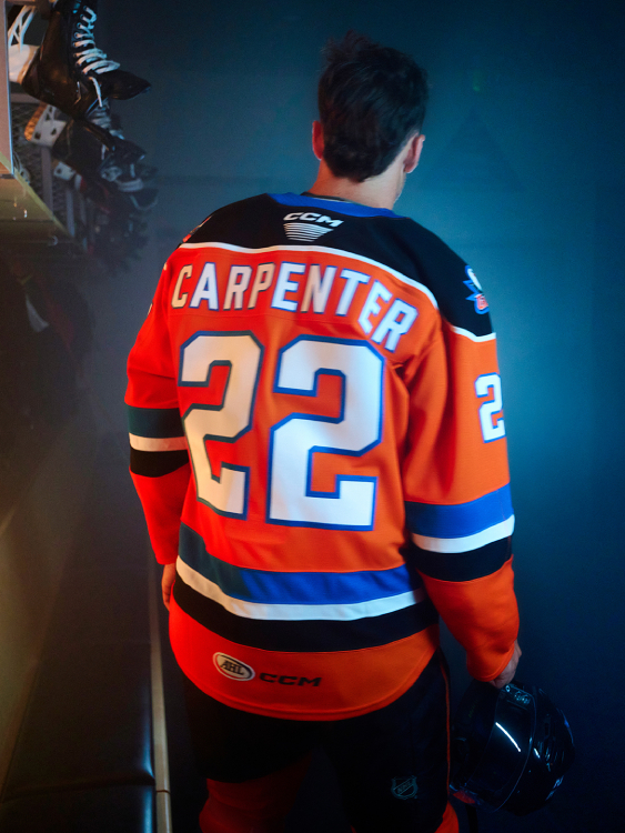 The Gulls’ primary set includes a white and a black jersey, both with black shoulders outlined in blue, orange forearms and orange, white and blue stripes up the sides. Both have an “SD” logo on the right shoulder and a Ducks logo on the left. In recent seasons, they’ve also worn a blue alternate jersey with “GULLS” written in orange and arched across the front.