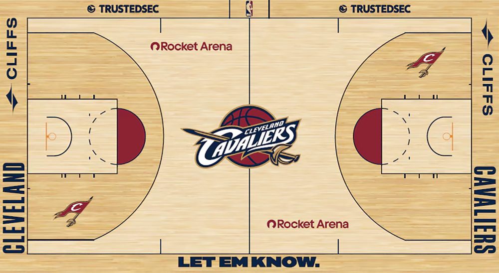 The court is complete with “Cleveland” on the left baseline and “Cavaliers” on the right, both of which are dark navy blue and joined by an advertisement for Cliffs. The franchise’s “Let ‘Em Know” mantra is also on the bottom sideline.