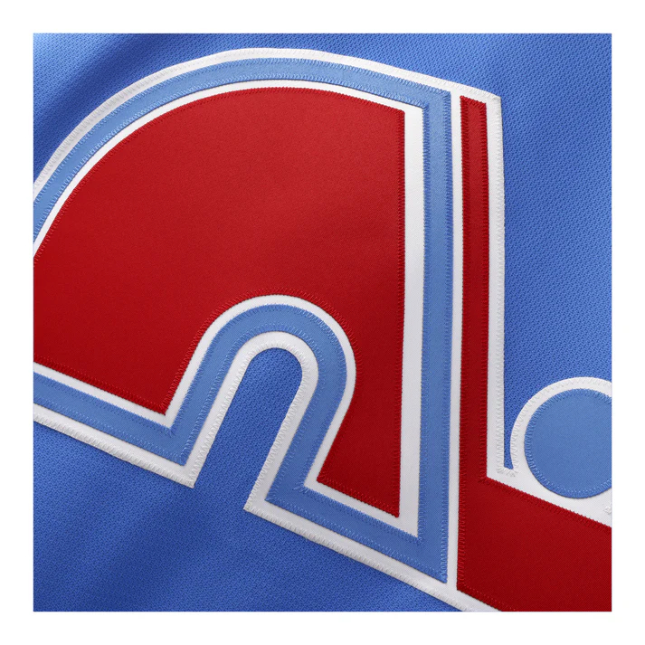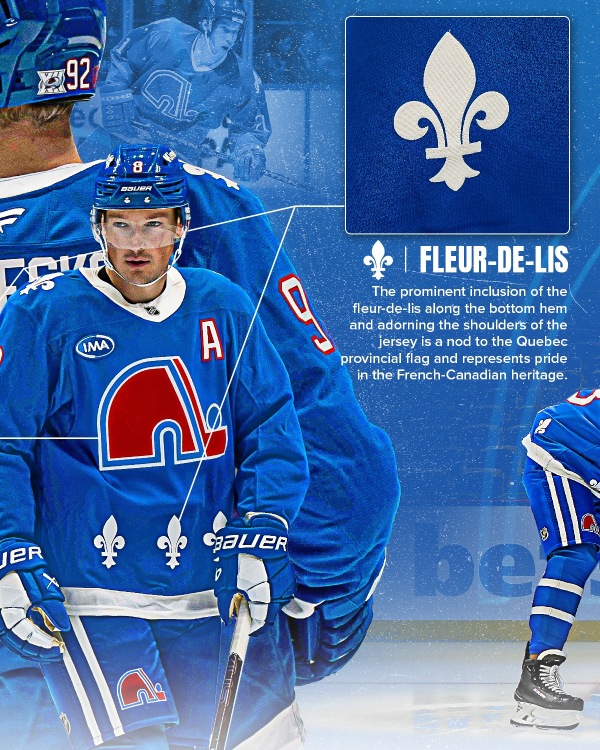 The jerseys are a faithful recreation of the Nordiques’ road jerseys from 1980 to 1995. The blue base has a red Nordiques igloo crest on the front, along with a white collar, sleeve cuffs and hem stripe. Along the waist above the hem stripe sit three white fleurs-de-lis. White fleurs-de-lis also appear on the shoulders.