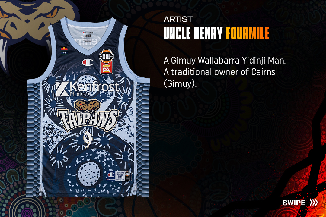 The uniform takes inspiration from Uncle Henry’s artwork representing the Seven Sisters Dreamtime story. It is widely known story by First Nations peoples across Australia and relates to the star cluster known as the Pleiades in the constellation Taurus. In Far North Queensland, this ancient story is also represented in the Atherton Tablelands with the Seven Sisters Trails, which link the towns of Atherton, Malanda and Yungaburra. The Seven Sisters guide, protect and watch over Cairns – comparatively, the Taipans represent the region with great respect, and go to battle for the city on the basketball court.