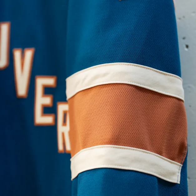In Vancouver, “earthy bronze” has been added to the previously announced Pacific Blue and cream colour scheme. The cream road jersey has a blue collar and shoulders, a bronze panel bordered in blue at the waist, and blue stripes bordered in bronze on the sleeves. “VANCOUVER” is blue with a bronze outline, as are the numbers on the sleeves and back. On the blue home jersey, the blue striping elements switch to bronze and the bronze elements become cream. The front lettering and numbers are cream with a bronze outline.