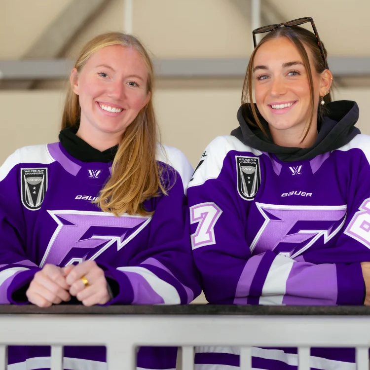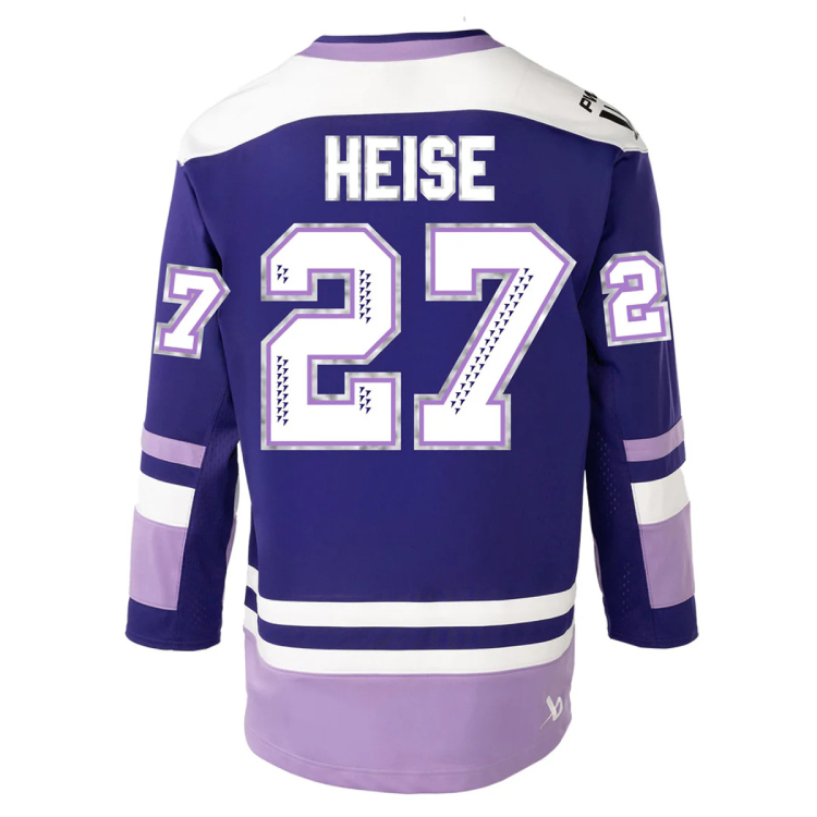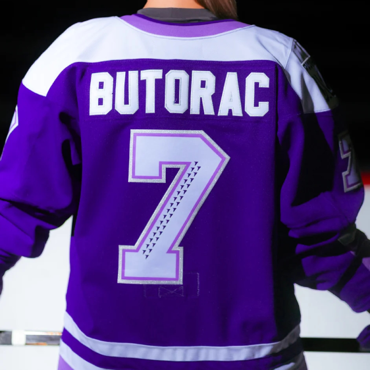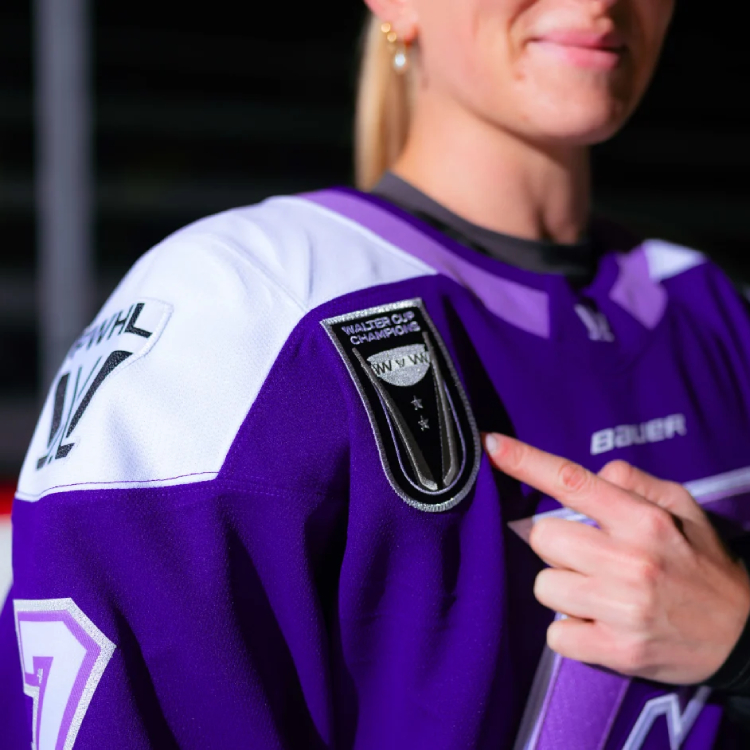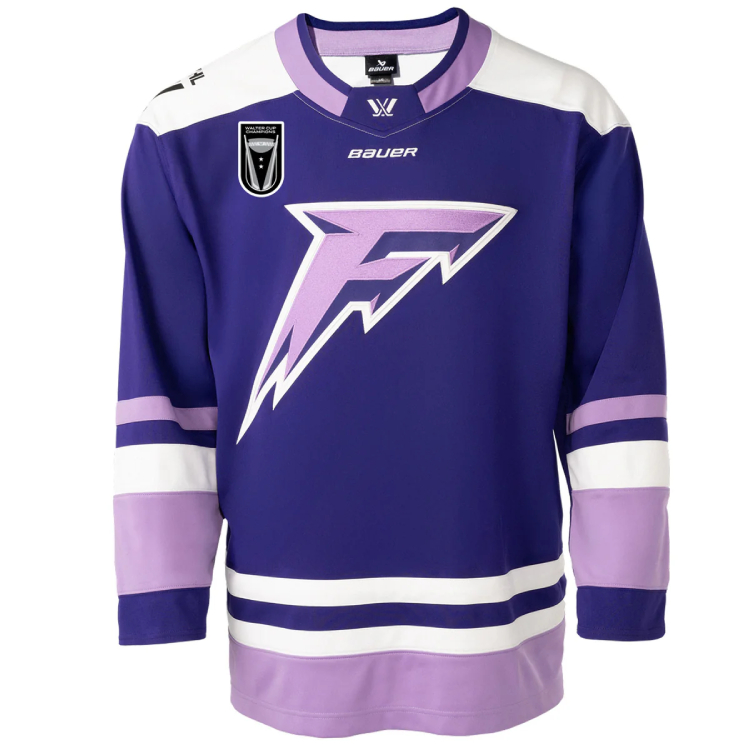 The commemorative jerseys add silver accents to the Frost’s usual purple home jerseys, including outlines around the names and numbers on the back and sleeves. It also includes a champions patch on the chest with the Walter Cup trophy and two stars, one for each of their titles.