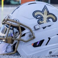 The white helmets, which were unveiled this summer, feature a predominantly gold version of the Saints’ fleur-de-lis logo on the sides, as well as a black and metallic gold striping pattern down the center and a gold facemask.