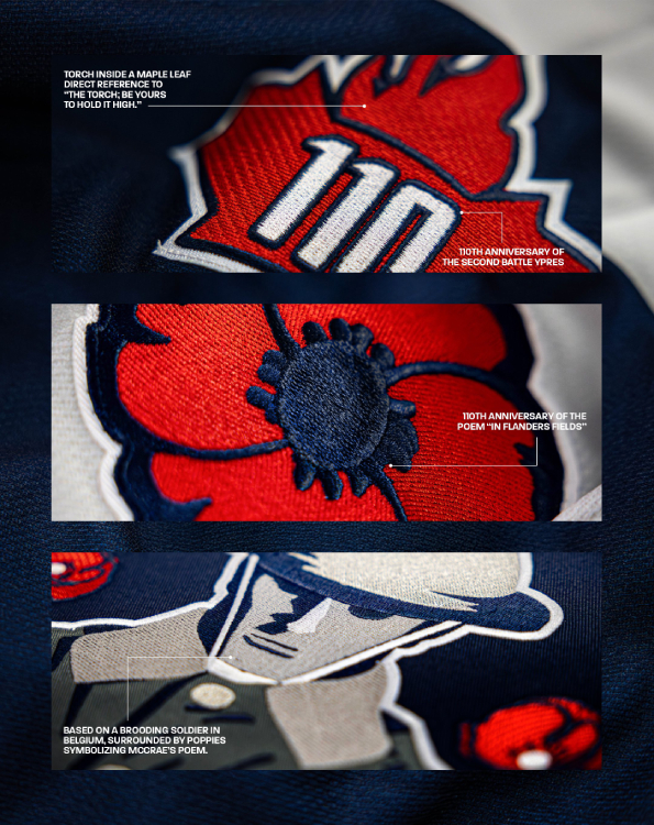 The crest on the front of the Rangers’ latest jerseys ties directly into the Second Battle of Ypres. It depicts the St. Julien Canadian Memorial in Langemark, Belgium, which is also known as “The Brooding Soldier.” Sitting inside a navy blue circle on the front of the light grey jersey, the monument is surrounded by red poppies “symbolizing McCrae’s timeless words and the enduring spirit of remembrance.”