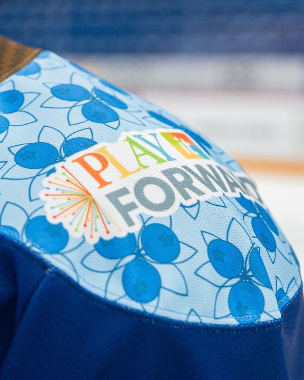 Numbers on the sleeves and back were one-colour light blue, while names were royal blue on a contrasting white nameplate. The Wolves’ primary logo sat on the right shoulder, while the left shoulder featured the logo of Play It Forward, a charity that helps underprivileged kids grow and develop through sports. Proceeds from the auction of game-worn and game-issued jerseys will benefit the charity.