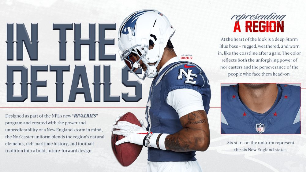 The “Rivalries” uniforms – which bring to mind MLB’s City Connect and the NBA’s City Edition programs – will be worn just once this season by members of the AFC East and NFC West but will remain in the team’s rotation for three seasons, allowing them to be worn in a home game against a different divisional opponent each year.