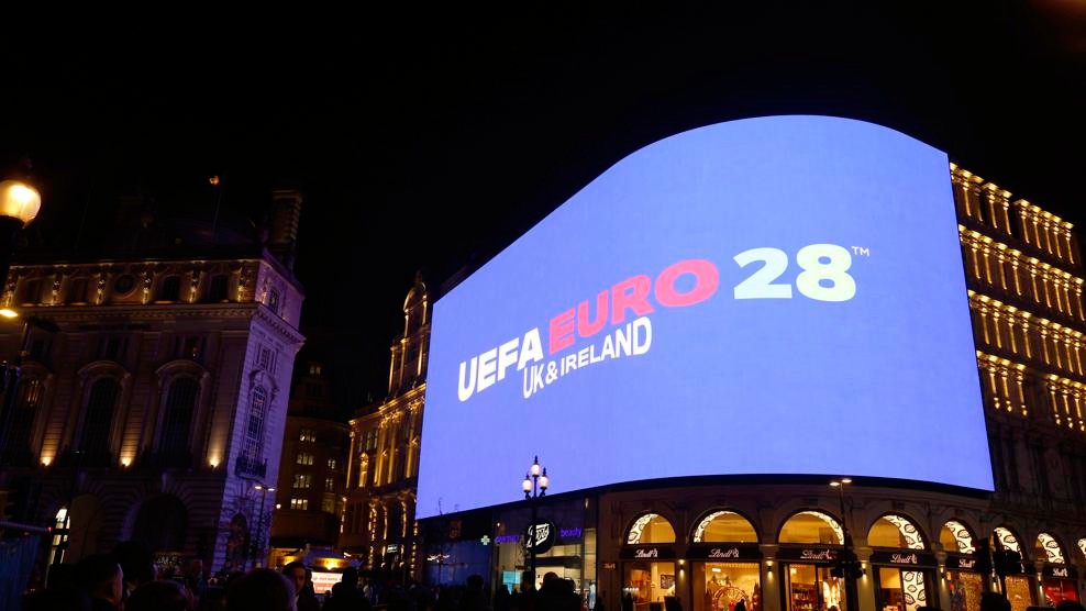 The tournament will be held in June and July 2028 in the United Kingdom and Ireland, with national teams competing for continental supremacy. The logo was unveiled at exactly 20:28 local time when it appeared on giant digital screens at London’s Piccadilly Circus, as well as on screens and projected on landmarks in other host cities.