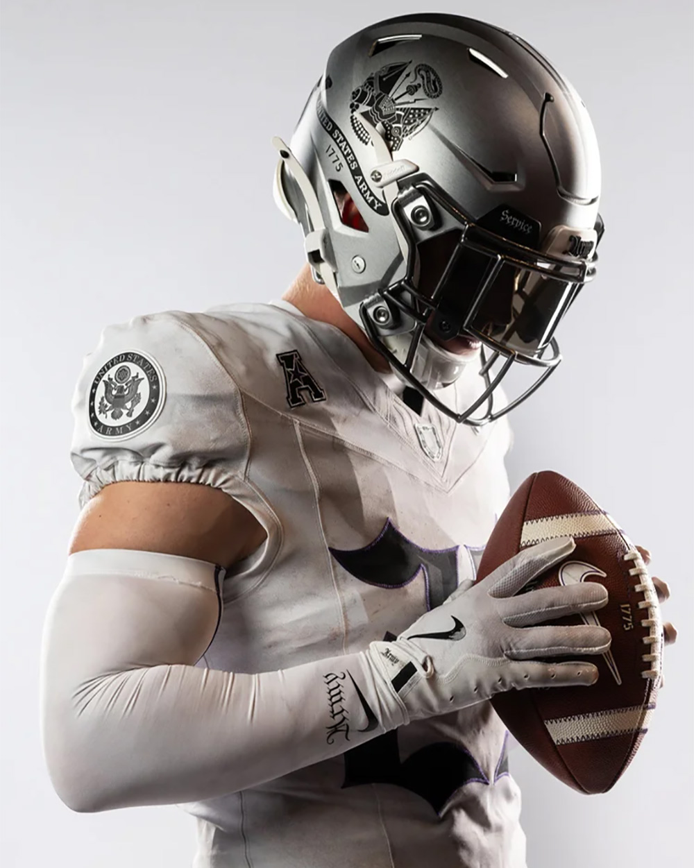 Army’s all-white Nike uniforms feature a subtle marble print on the jerseys and pants that mimic the headstones in Arlington National Cemetery, honoring those who gave their lives in service of their country, as well as a number and nameplate font that is written in the same style as the United States Constitution.