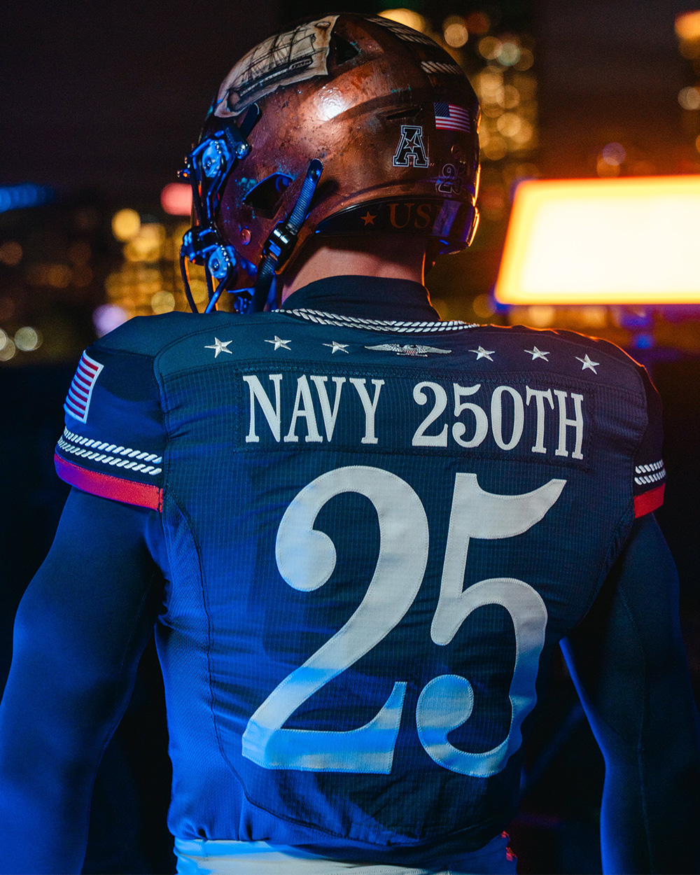 The original United States Navy monogram can be seen on the right side of the helmets, while a wooden plank runs down the center, with six ropes wrapped around it in honor of the original frigates. The ropes also feature 126 knots for the 126th Army-Navy Game, while the back bumper is marked with “USN 250.”