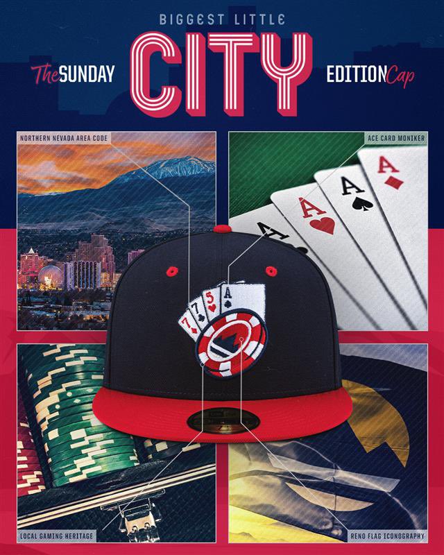 The logo on the new cap features a poker chip that includes iconography derived from Reno’s city flag. The logo also features playing cards arranged to form northern Nevada’s 775 area code, along with an ace in tribute to the team’s nickname.