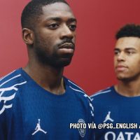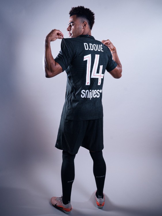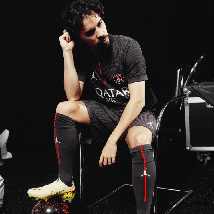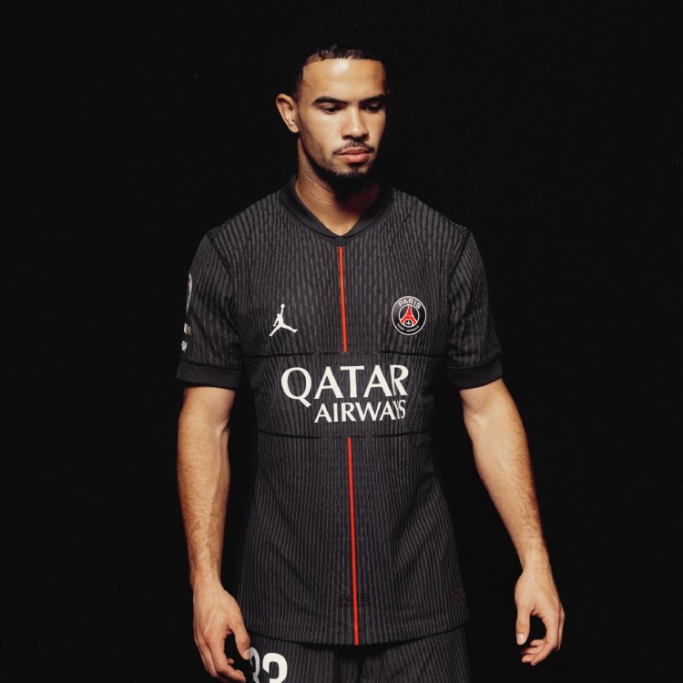 The kit is predominantly black, with touches of anthracite grey throughout and a single red pinstripe running vertically down the middle of the shirt. The red stripe is “a subtle, contemporary nod to one of the Club’s original designs,” PSG says on its website. “A line that becomes a symbol of style, vision, and precision — like one drawn, traced, and refined on a workshop pattern or a chalkboard.”