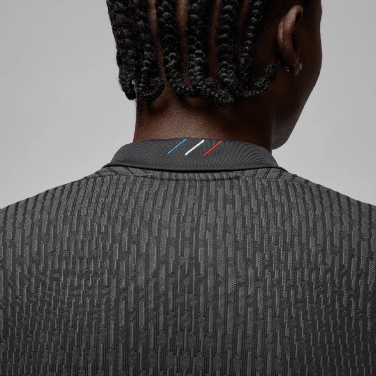 Two black lines run horizontally across the chest, between which is the logo of PSG’s main sponsor, Qatar Airways, in white. The Jordan Jumpman logo appears on the right chest in white, while the club crest on the left chest has been recoloured in black and red. The sleeve cuffs and foldover collar are solid black, though the collar does have three diagonal lines in the colours of the French flag stitched on the back.