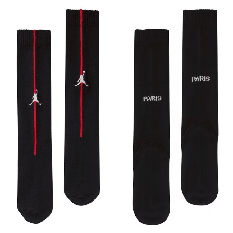 The black shorts carry the same anthracite pattern as the jersey, with the crest on the right leg and the Jumpman logo on the left. The socks are solid black with a vertical red stripe down the front, along with a Jumpman logo on the shin, and a “PARIS” wordmark on the back.