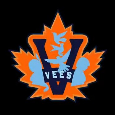 The jersey has a light blue base, with two sets of stripes around the waist and each sleeve: navy blue, light orange and a darker orange. The crest on the front of the jersey retains the letter V, the banner reading “VEES” and the maple leaf shape from the team’s primary logo, but inside is a special light blue graphic on an orange background.
