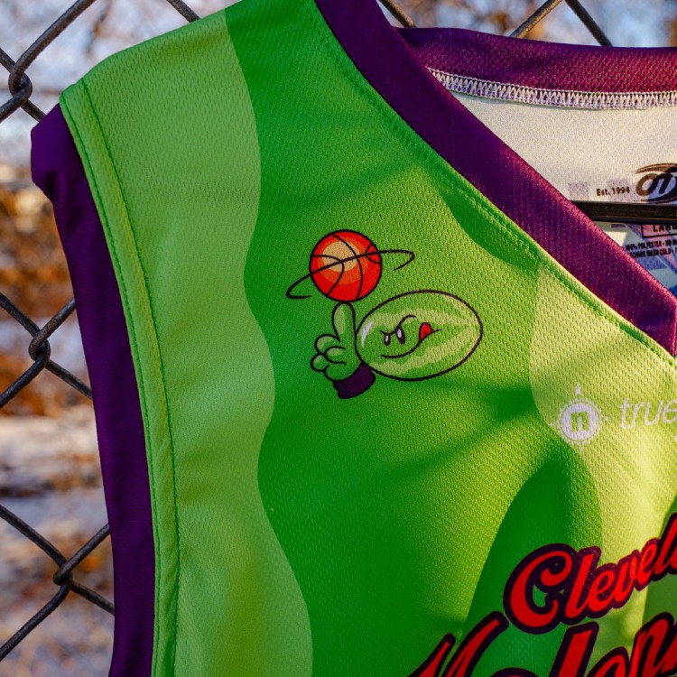 The Melonheads jerseys that the Charge will don are green with wavy tonal vertical stripes to mimic the markings on a watermelon. The team name is written out in a script font across the chest, while the V-neck collar and trim around the arm holes are purple.
