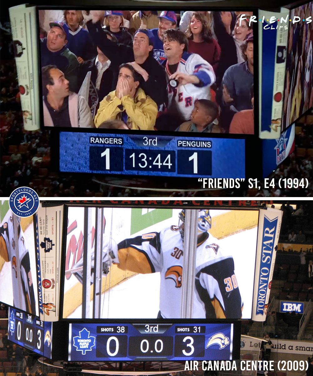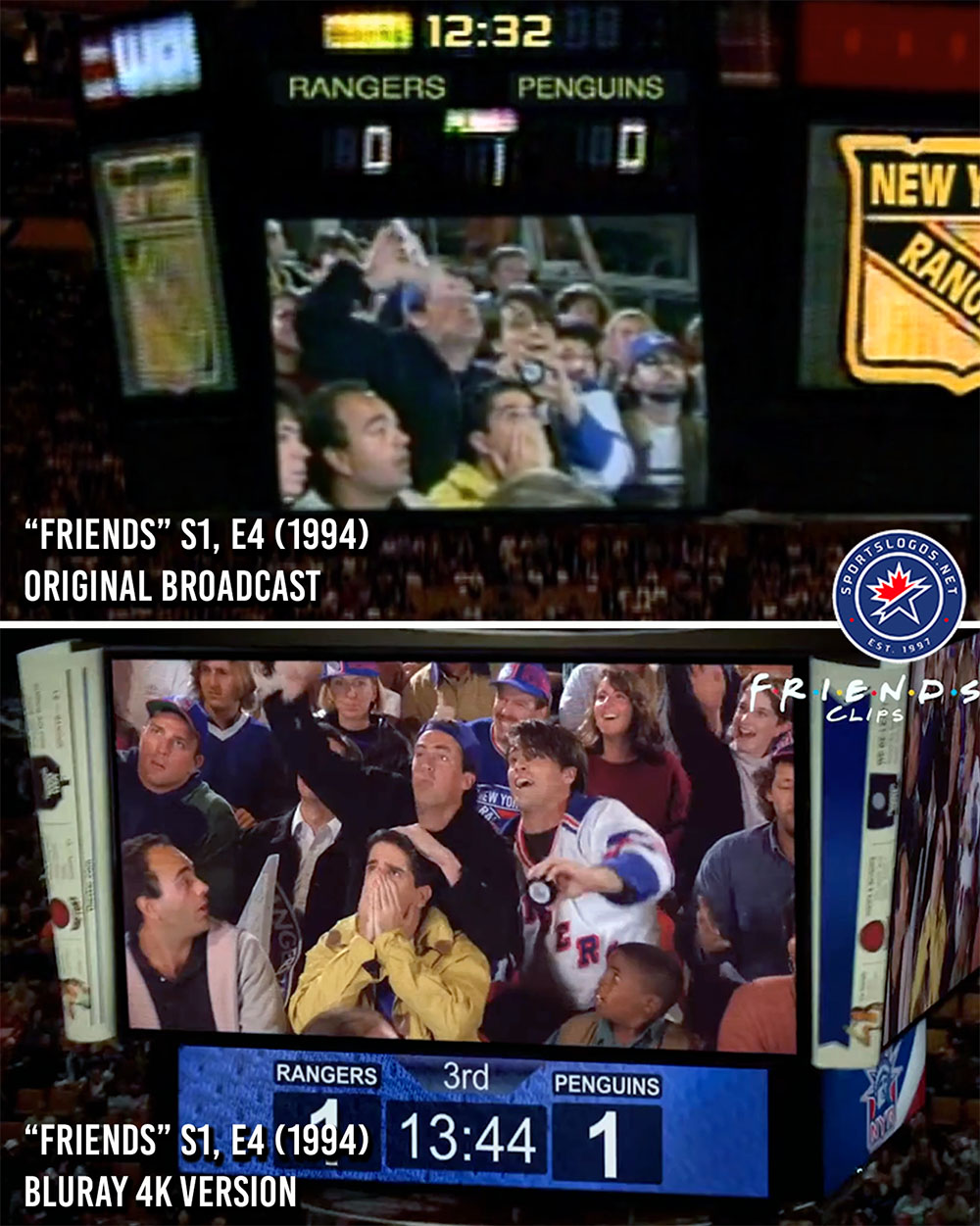 It appears that during Friends’ remastering process for Blu-ray and later 4K broadcasts, the original scoreboard footage was replaced. Likely due to image quality limitations, the production substituted a much newer arena scoreboard, unintentionally crashing the New York Rangers’ logo timeline.