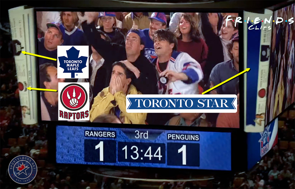 As I spent more time studying the screenshot from Friends (and bugging Clark Rasmussen of DetroitHockey.Net about it), the scoreboard itself started to feel out of place for the mid-1990s. The technology, layout, typography, and overall graphic treatment all appeared far more modern than what NHL teams were using at the time. We also noticed that on the edges of the scoreboard was what looked to be a Toronto Maple Leafs logo, and below it a graphic resembling an intentionally obscured Toronto Raptors secondary logo, a design that wouldn’t exist until 2008.