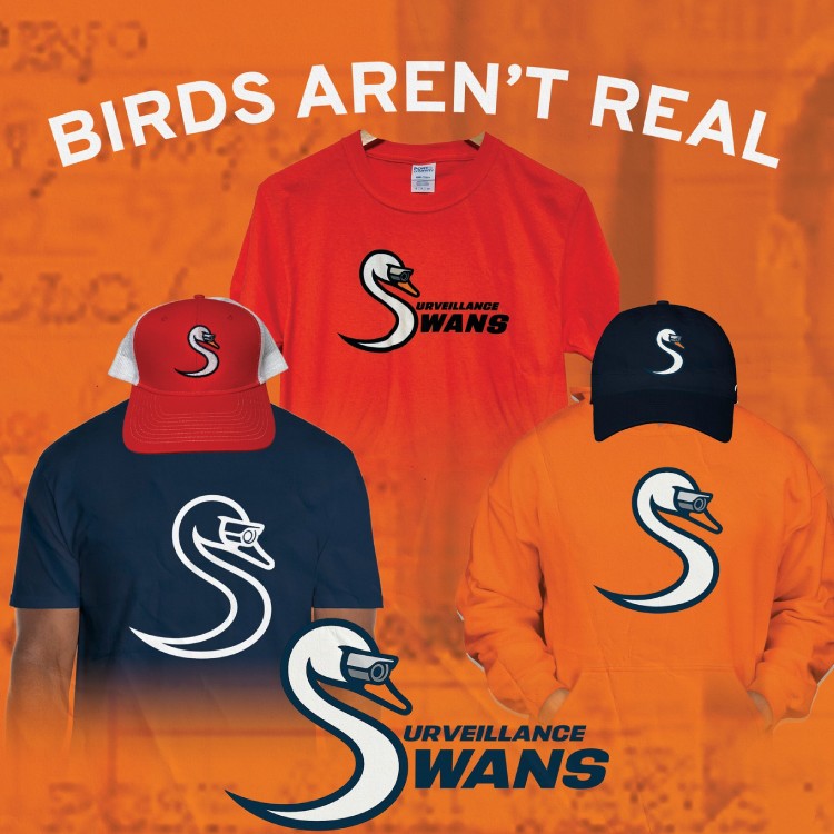 On Friday, December 12, the Madison Capitols of the United States Hockey League hosted their first-ever Birds Aren’t Real Night, fittingly against the Waterloo Black Hawks. For the occasion, they temporarily rebranded as the Surveillance Swans and donned special orange jerseys.