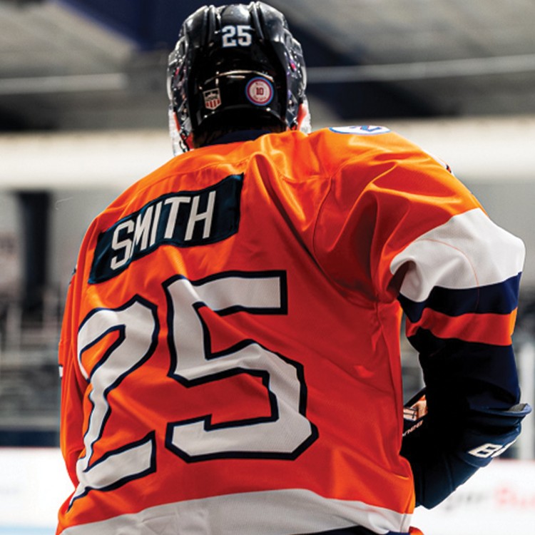 On the back of the jerseys, player names were set in white on a navy blue nameplate. Numbers on the sleeves and back were white with a navy blue outline. The Capitols’ primary logo appeared on the left shoulder, while a patch honouring Madison native and 1980 “Miracle on Ice” team member Bob Suter sat on the right shoulder. This patch also appears on their regular home and away jerseys.