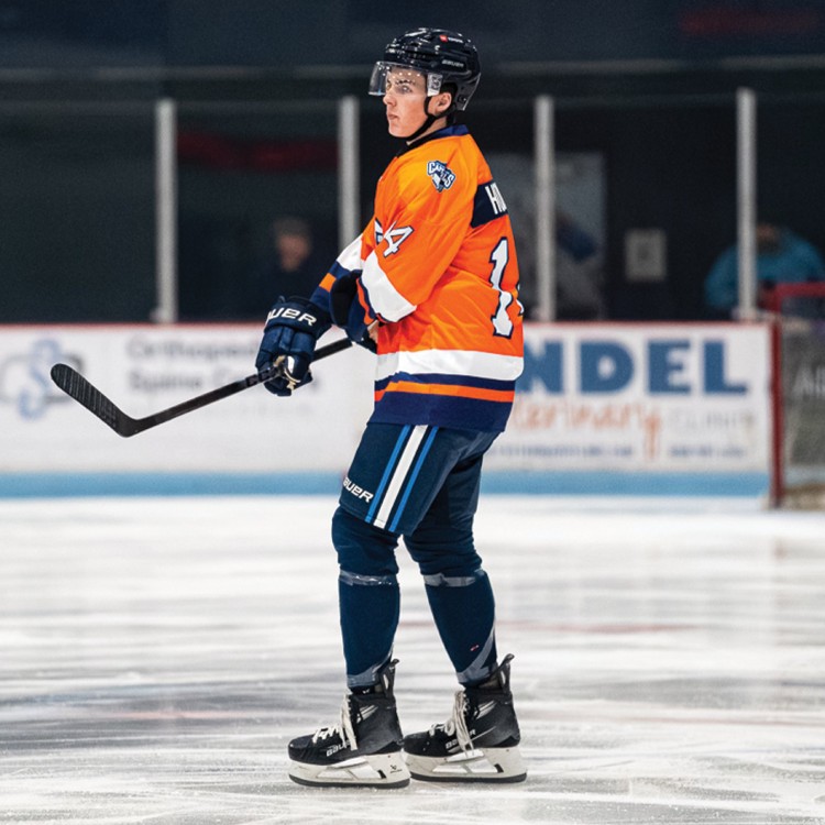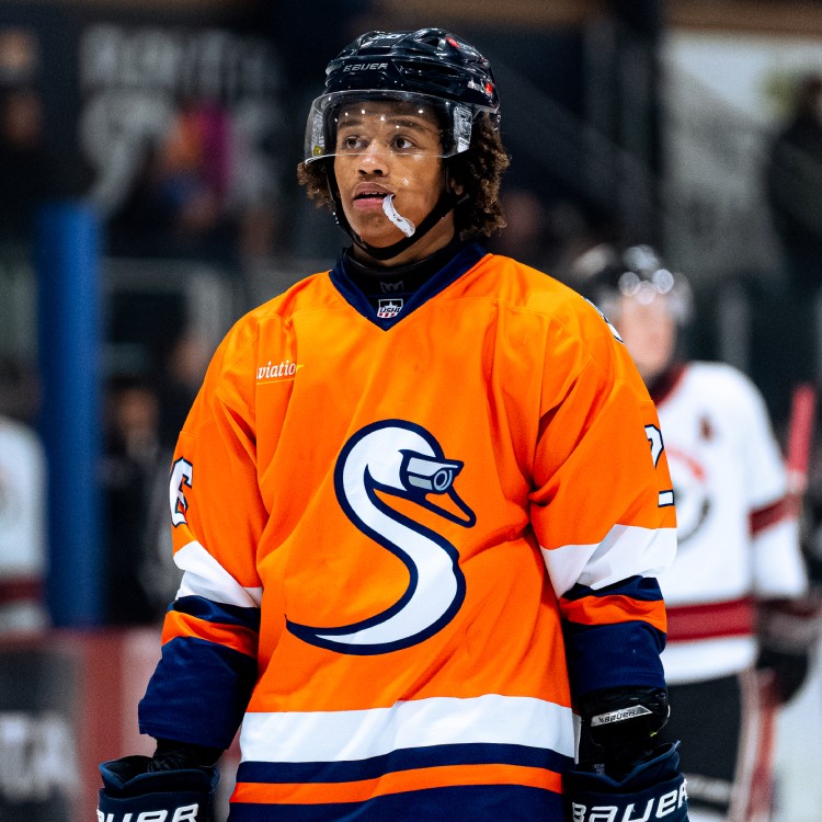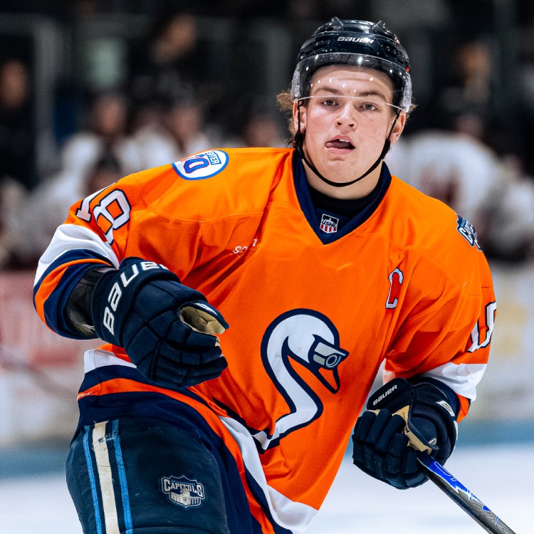 The Capitols did little to dispel the myth with their jerseys for Friday’s game. Their Surveillance Swans logo — a swan’s head and neck in the shape of an S, with a video camera for the swan’s eye — sat on the front of the bright orange sweater. The sleeves and waist had a broad white stripe with narrow orange and navy blue stripes below that served as a transition to navy blue panels on the forearms and hem.