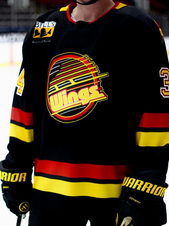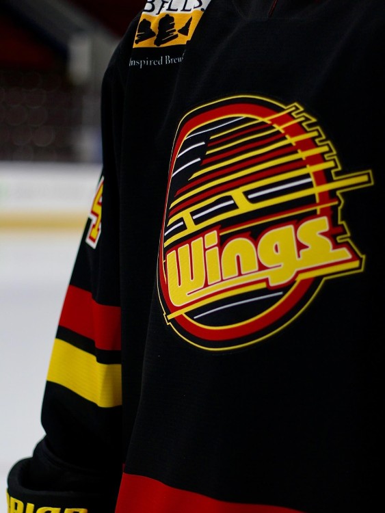The Wings, who are affiliated with the National Hockey League’s Vancouver Canucks, sported retro Canucks-style jerseys in their home game against the Iowa Heartlanders on Saturday, January 10. With a black base and yellow and red striping, the sweaters drew heavily on the Canucks’ road uniforms from 1989 to 1997 (which also serves as inspiration for the team’s third jersey introduced in 2022).