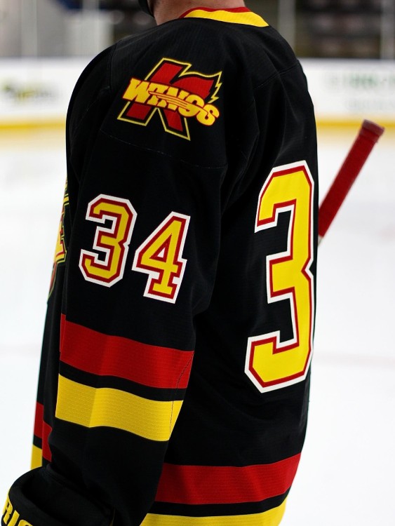 The centerpiece of the jersey is a flying skate logo fashioned after the one the Canucks introduced in 1978. However, instead of “CANUCKS” under the streaking skate, Kalamazoo added “WINGS” in a retro font.