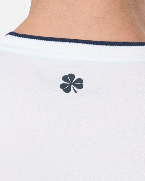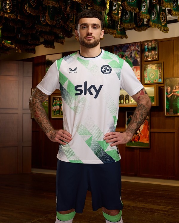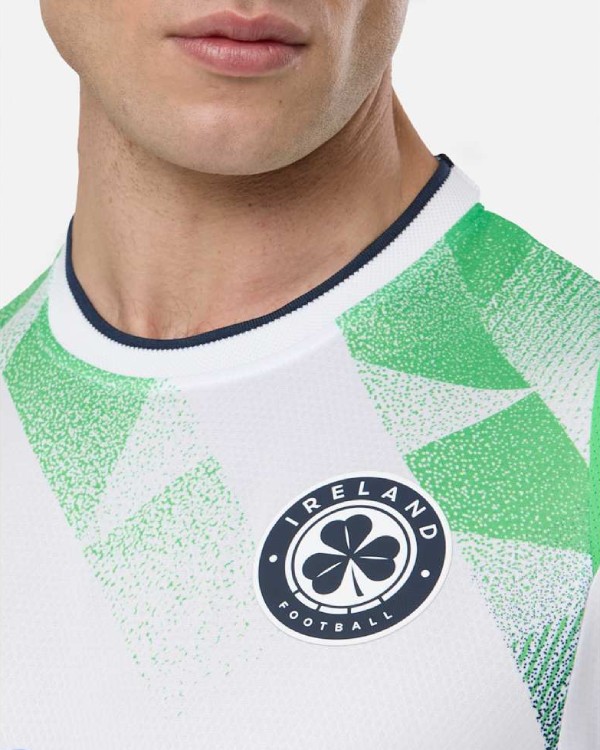 The away kit, meanwhile, is mostly white, with a one-colour black version of the national team crest on the left chest. A pattern of distorted geometric light green and navy blue shapes covers the front of the shirt, while the sleeves and back are solid white. The shamrock once again appears on the back collar, this time in black.