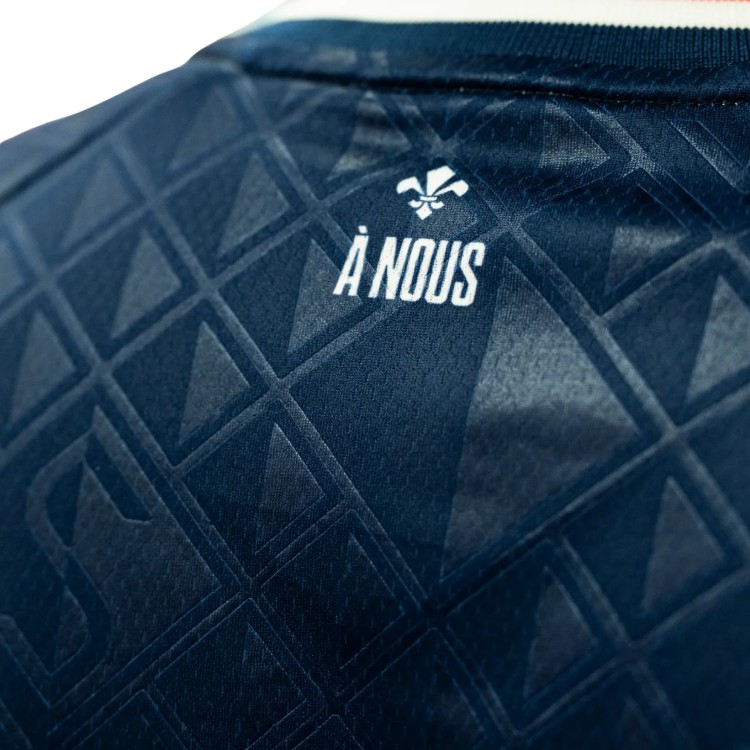 A Québec flag sits in the jock tag position near the front hem, while a Canadian flag appears on the left arm. On the back collar is s stylized fleur-de-lis with the slogan “À NOUS” underneath. The right arm a French-language version of the new Canadian Premier League logo in FC Supra’s colours. These recolored league logos will appear on all eight CanPL clubs’ jerseys this season.