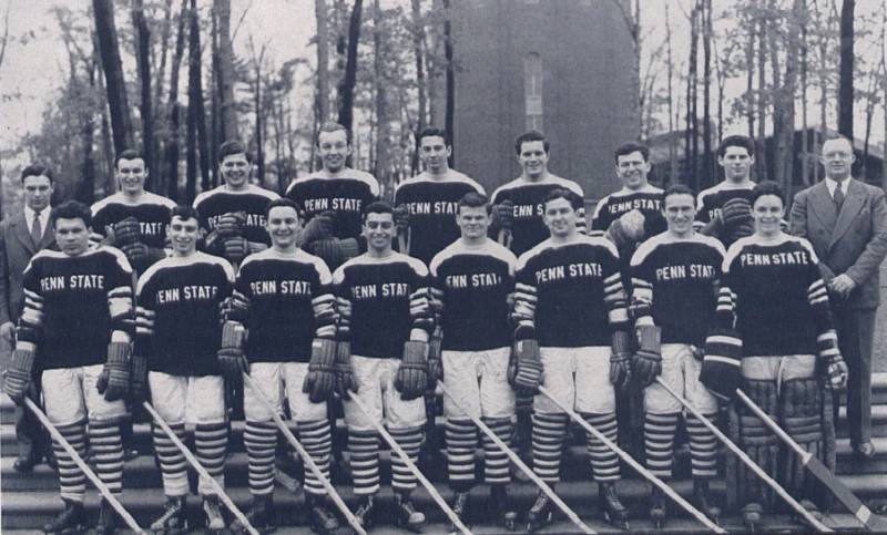 The navy blue jerseys have white shoulder yokes, and a wide white stripe flanked by two narrower stripes run around the sleeves. “PENN STATE” is written across the front of the jersey in the same font as the school’s name appears in the endzones at Beaver Stadium. All these elements mirror the jerseys worn by Penn State’s varsity hockey teams in the 1940s.
