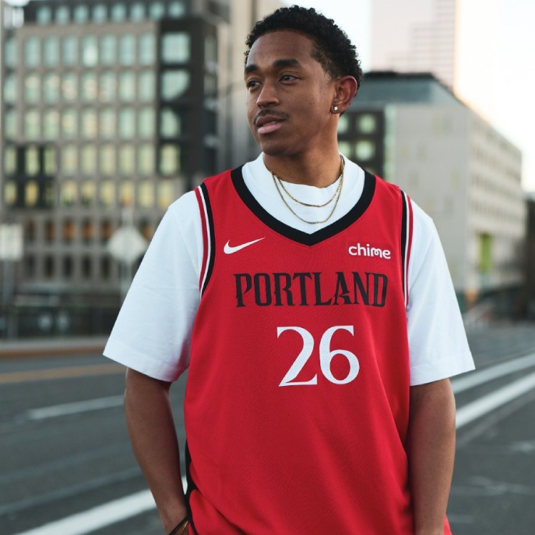The Explorer edition has a red base with black side panels that taper to points on the upper back and the lower front. The V-neck collar is solid black, while trim around the arm holes is black, white and red. “PORTLAND” is written in black across the chest, with the player number in a white serif font below. On the back, the number sits above the player’s name, which is also white.